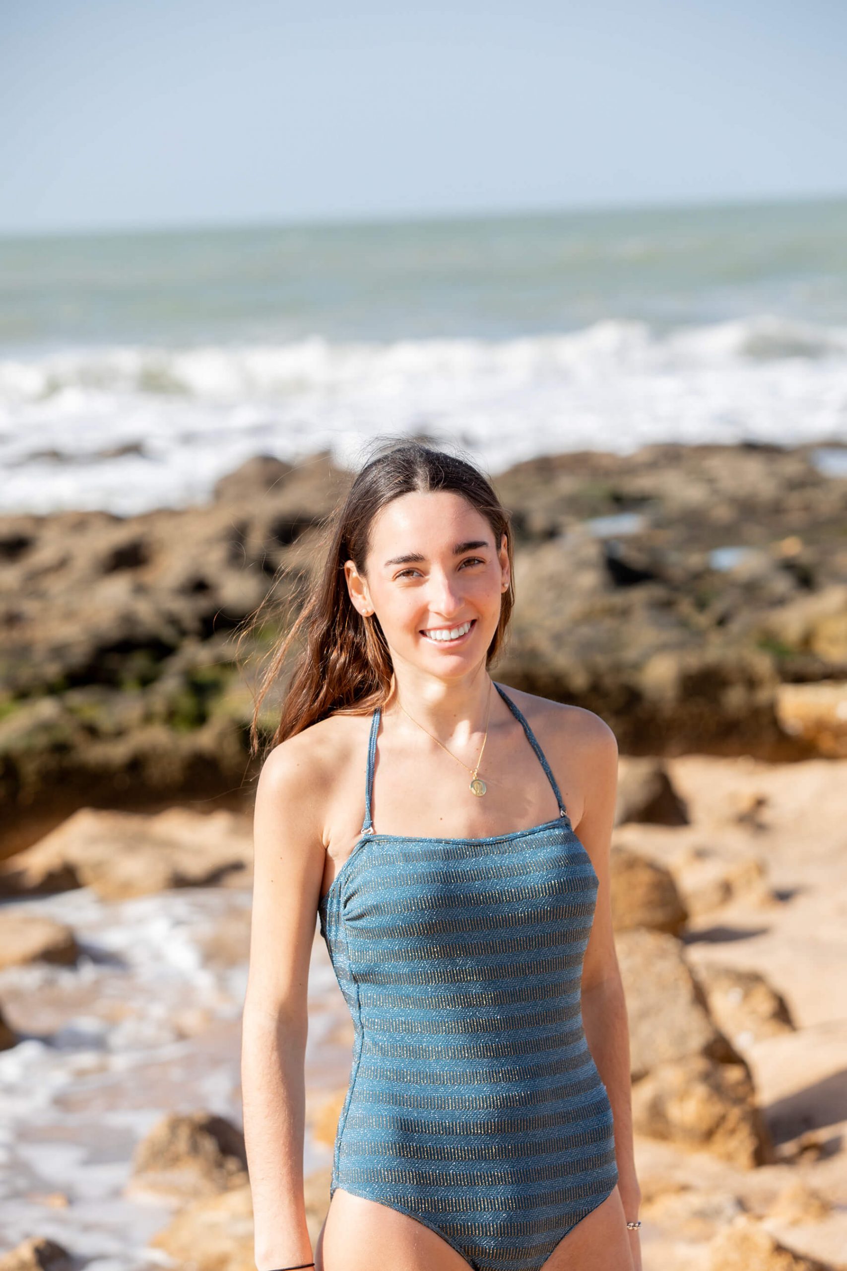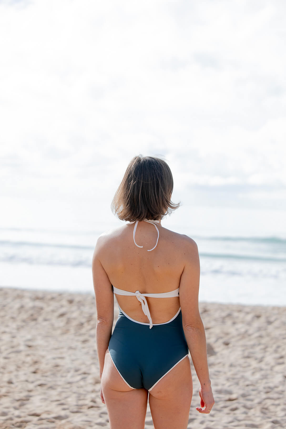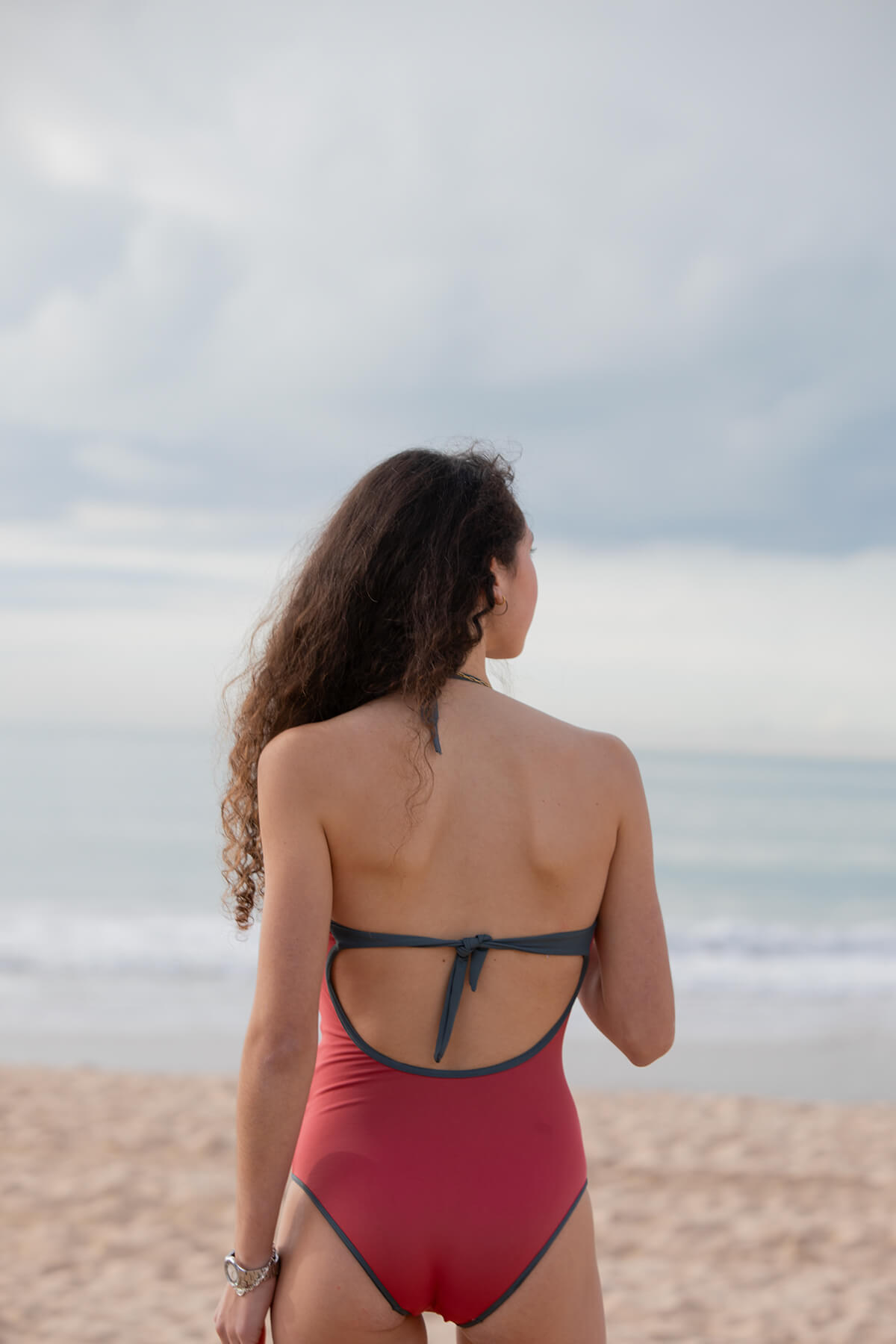 El modelo Isabel es un elegante traje de baño con reborde de color que va con anudado en el cuello y en la espalda. Lleva un forro absorbente de secado rápido y foam en la zona del pecho.