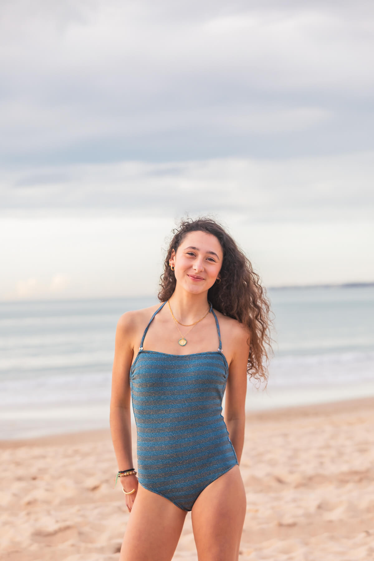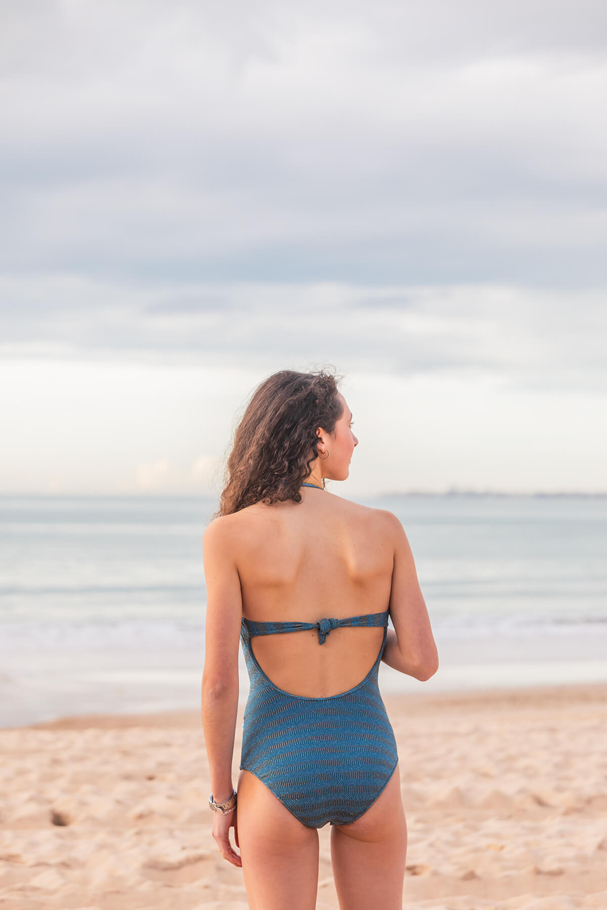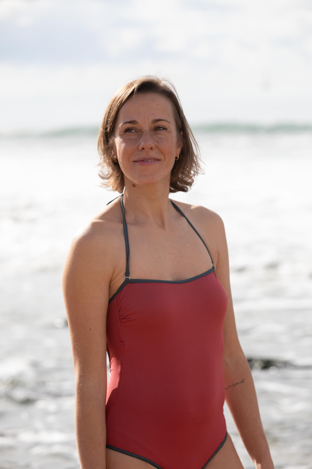 El modelo Isabel es un elegante traje de baño con reborde de color que va con anudado en el cuello y en la espalda. Lleva un forro absorbente de secado rápido y foam en la zona del pecho.