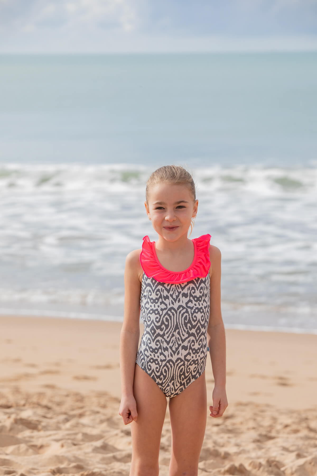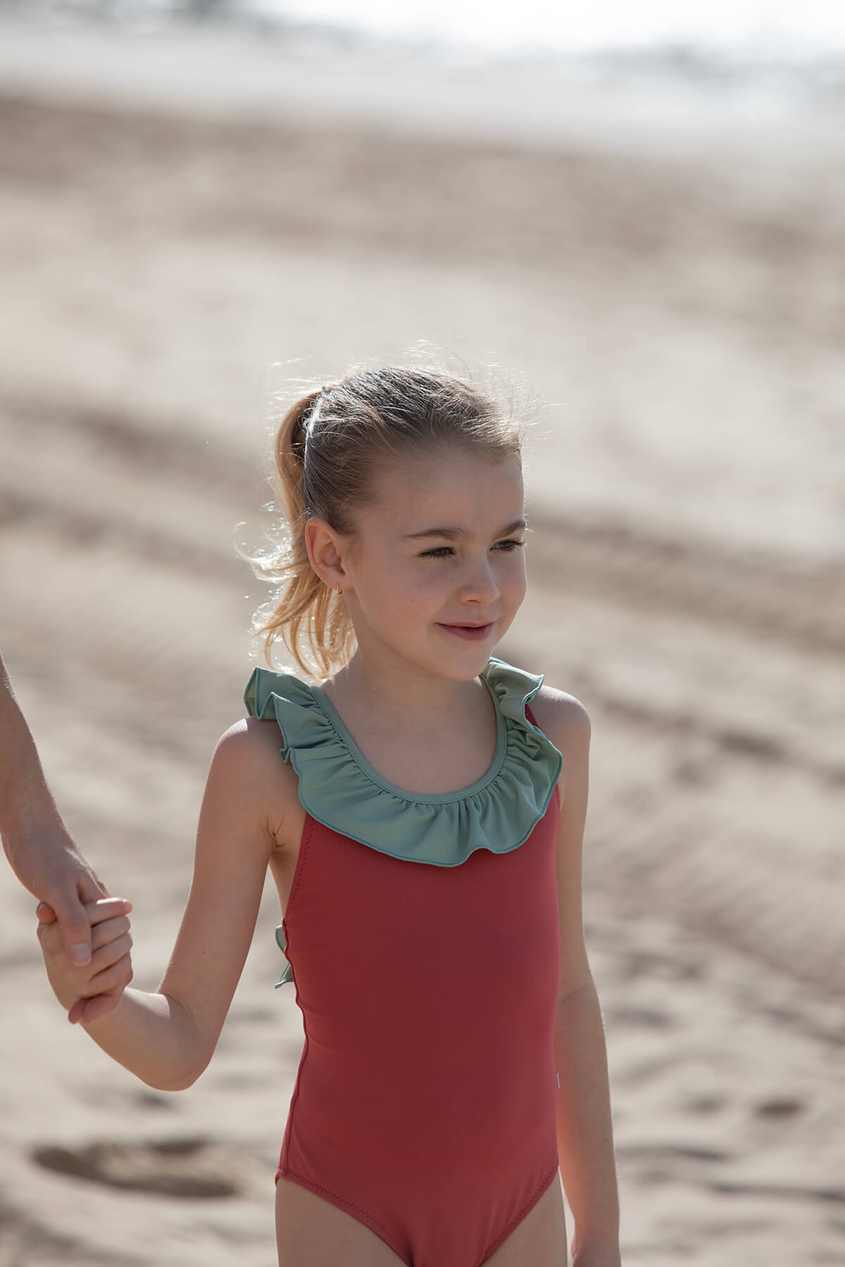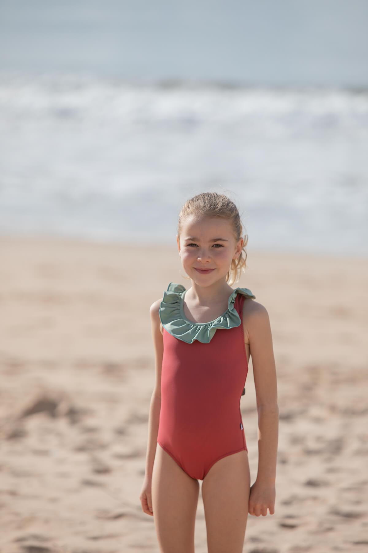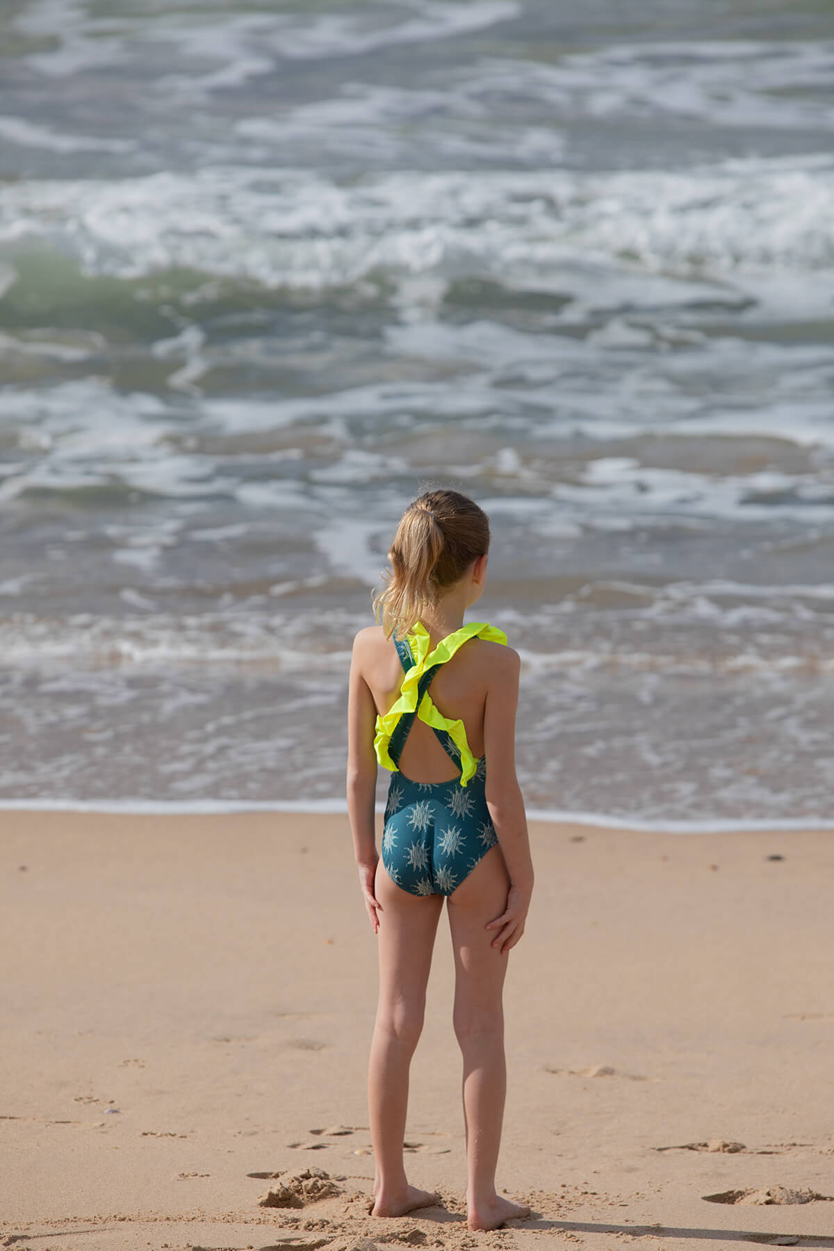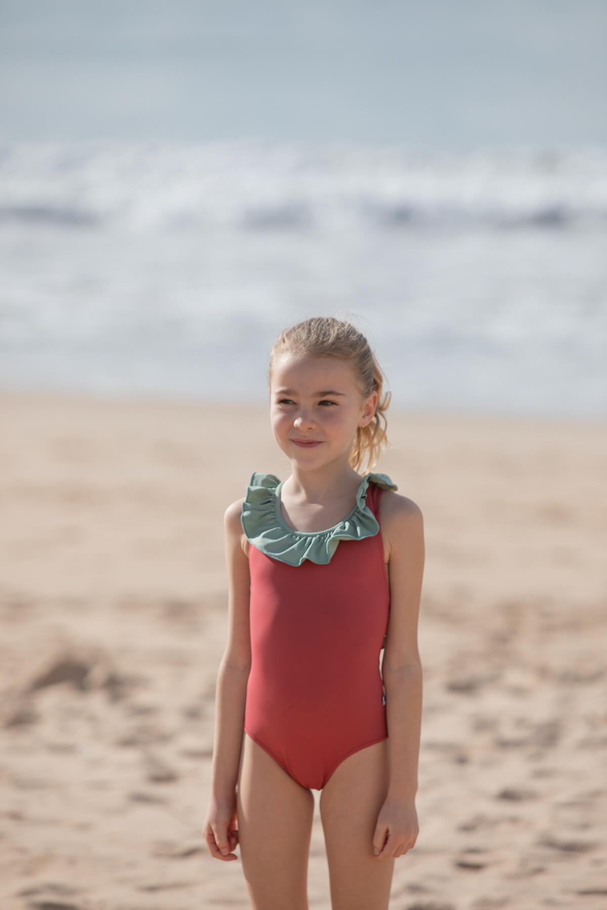 El modelo Muni es un traje de baño con volante al cuello que cierra en forma de cruz en la espalda. Lleva un forro absorbente de secado rápido.