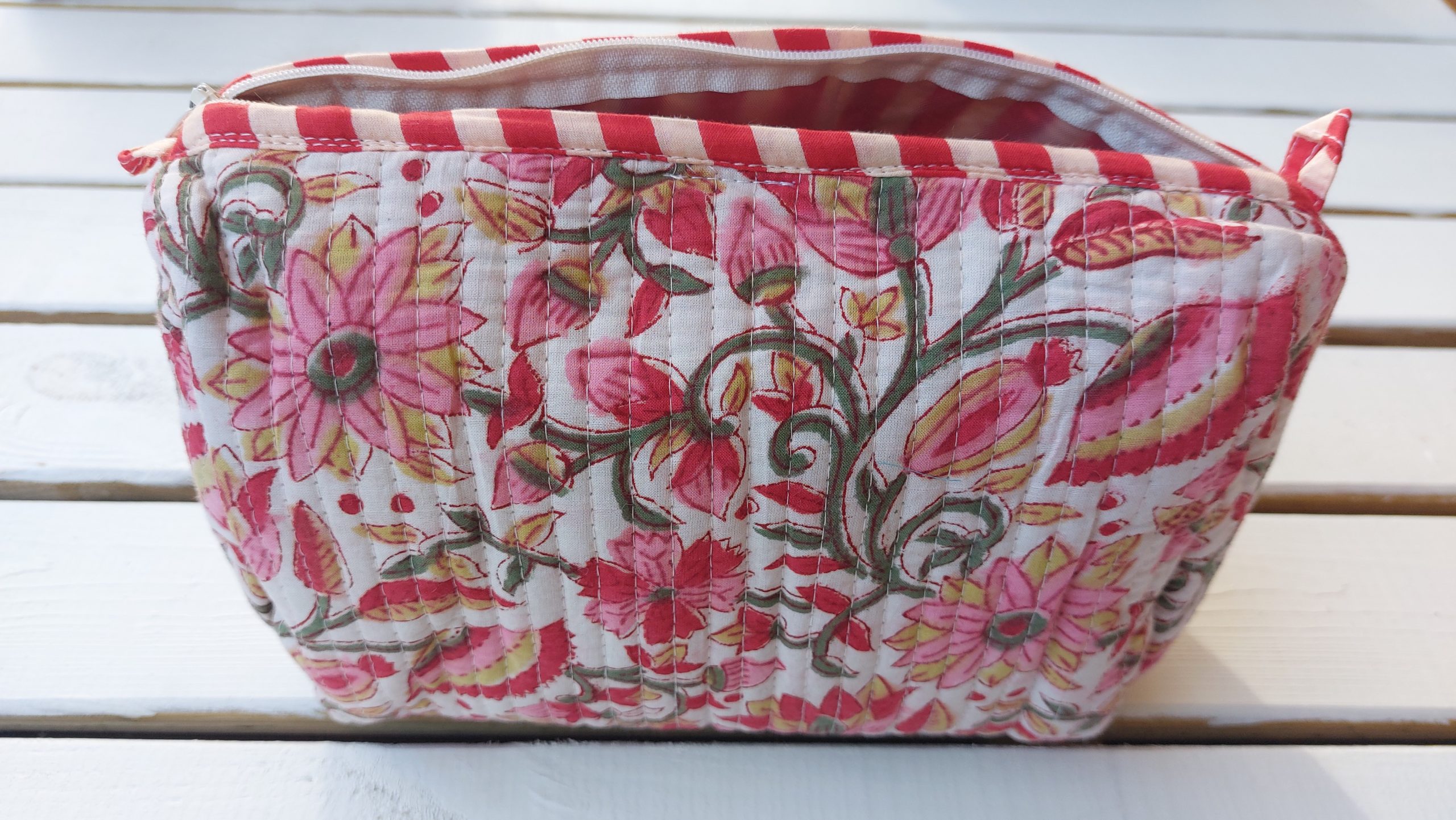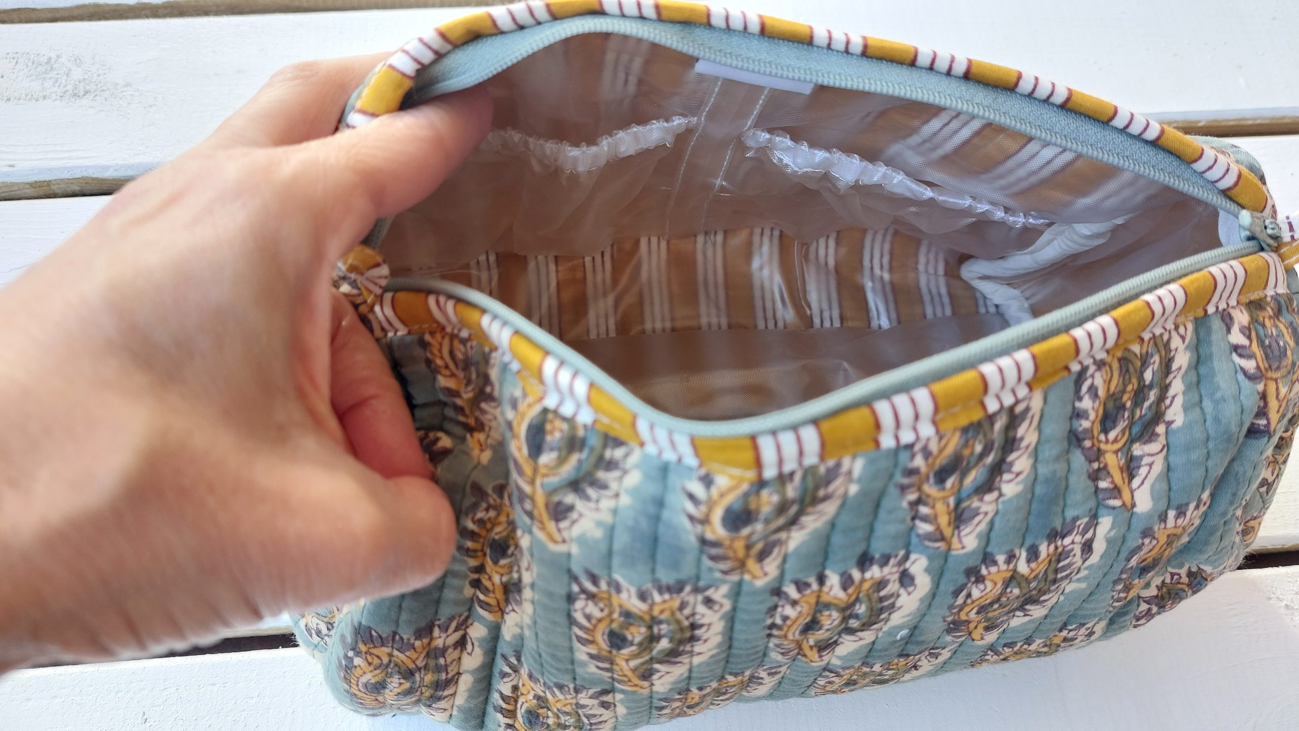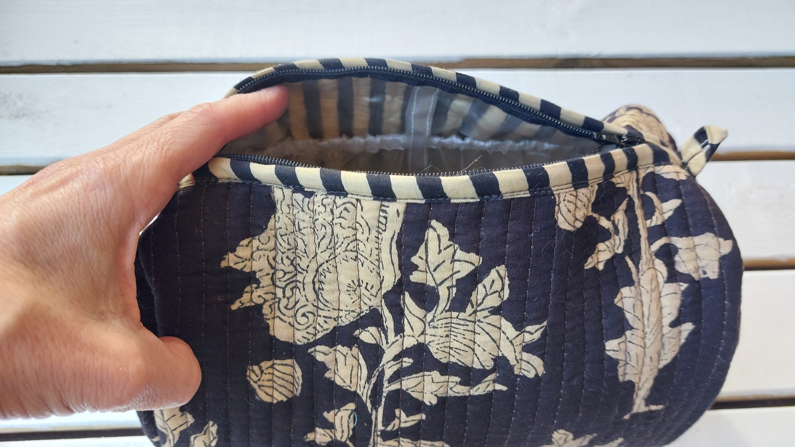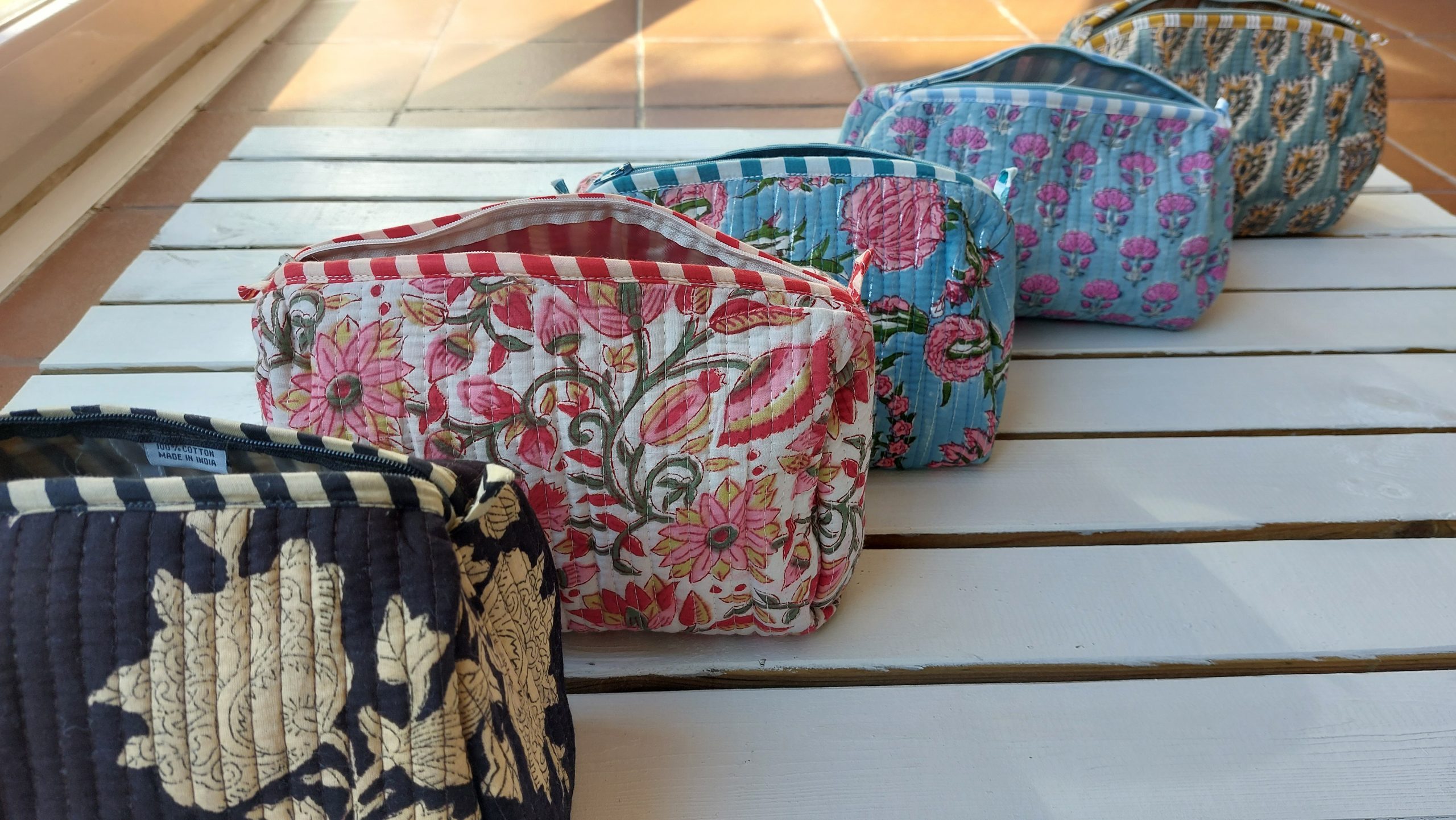 Neceser en tela de algodón acolchado y plastificado por dentro, con diferentes bolsillos para organizar de una manera más práctica.
