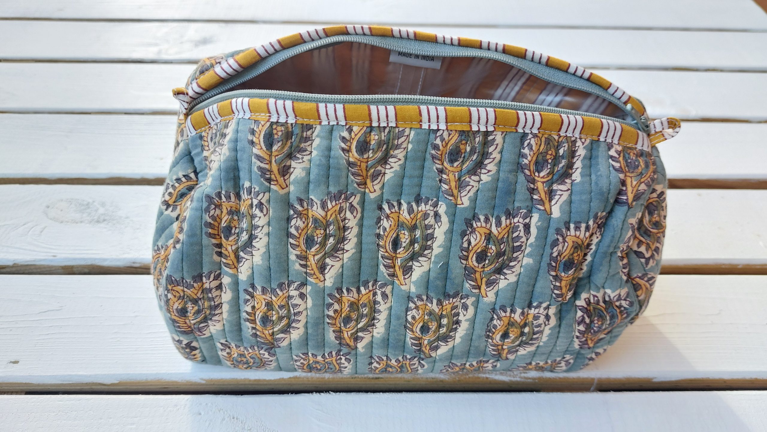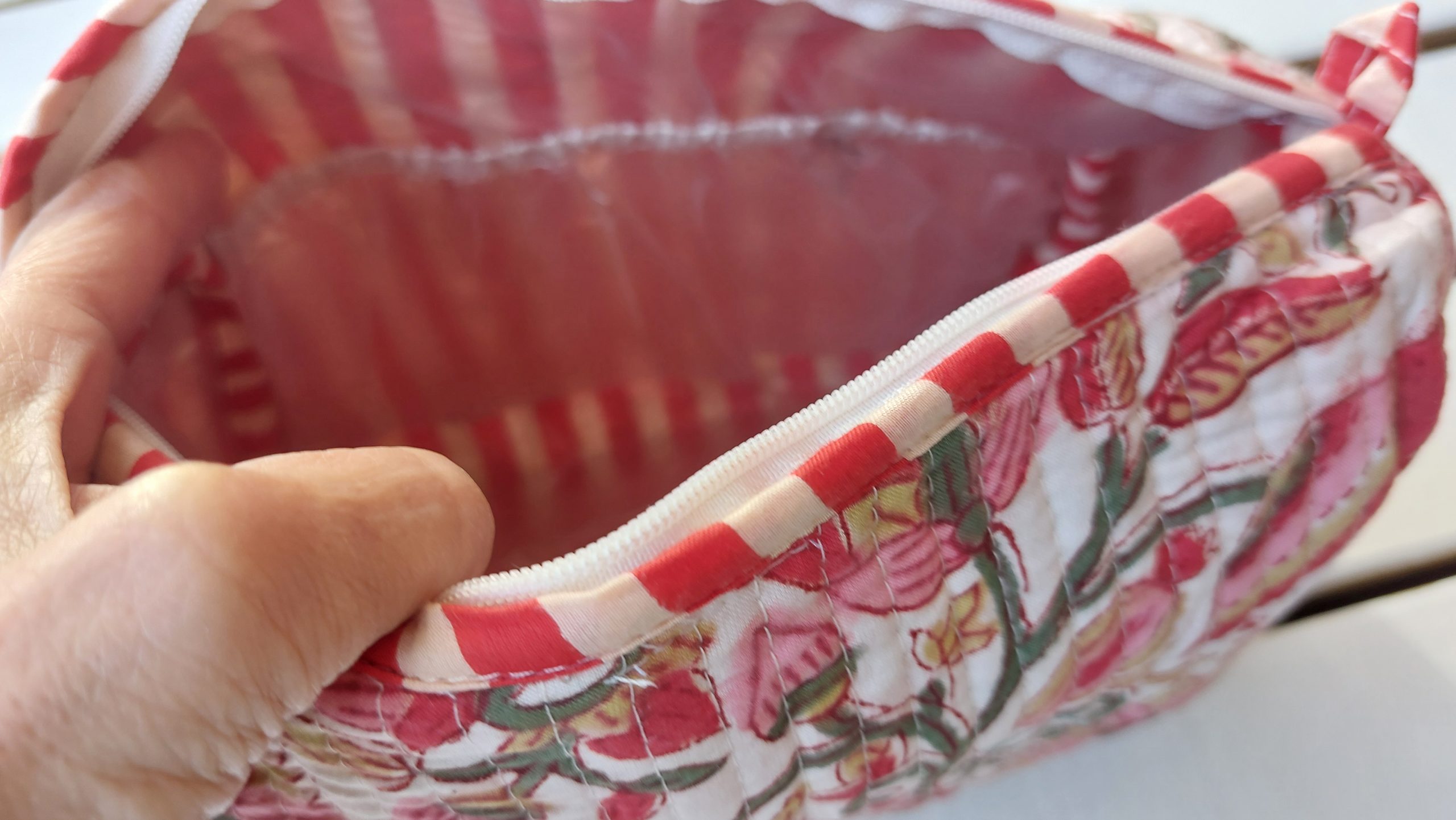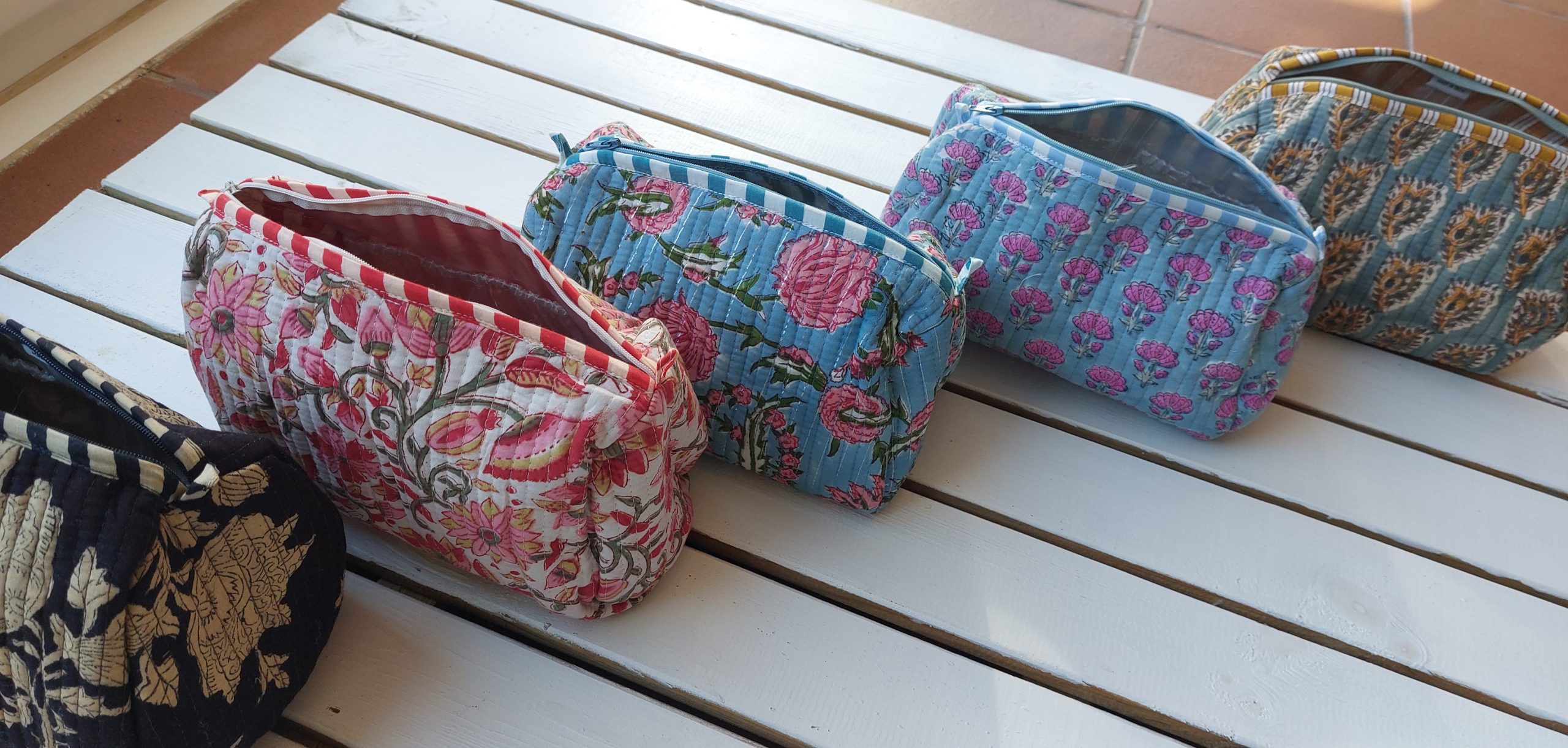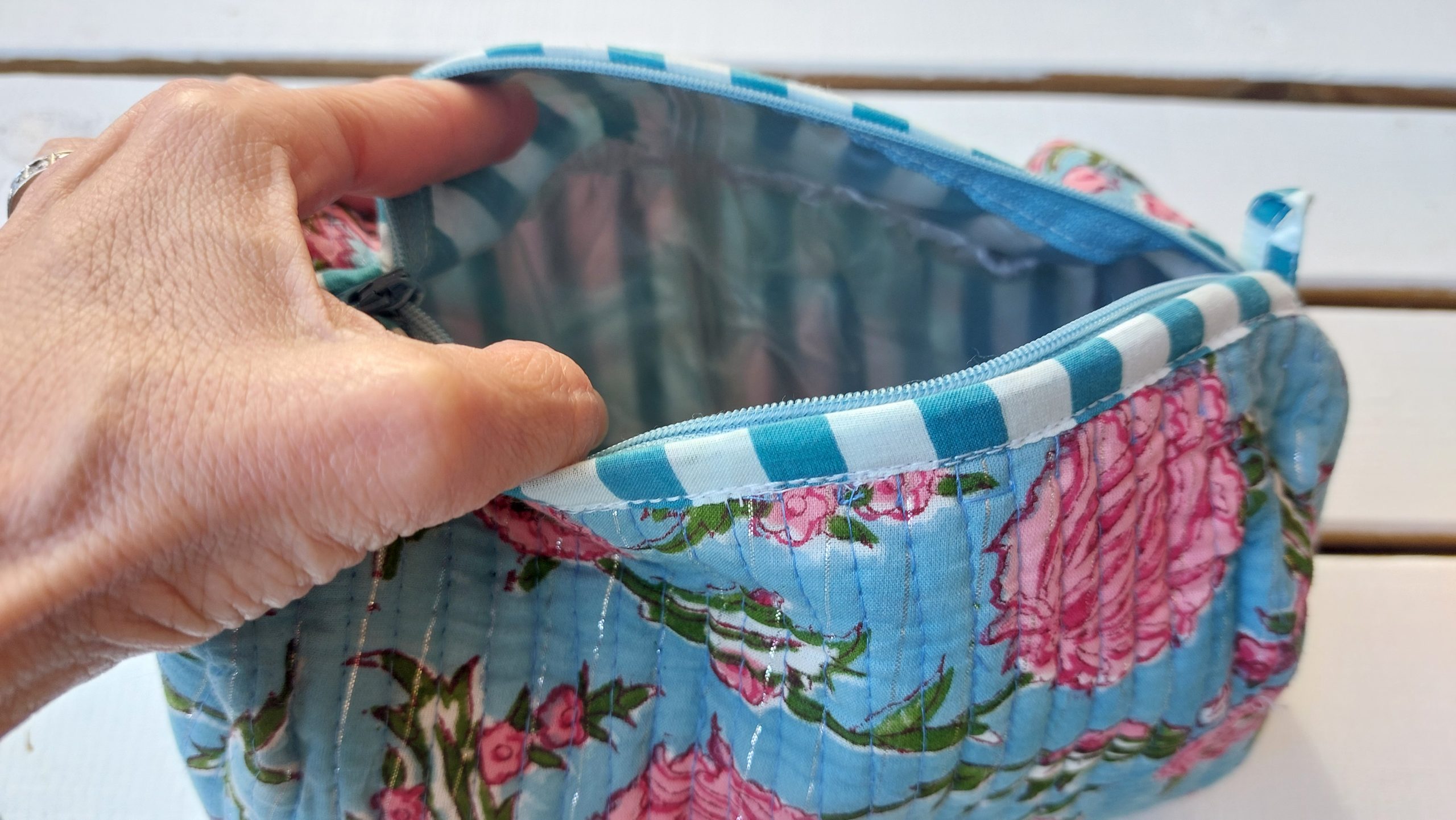 Neceser en tela de algodón acolchado y plastificado por dentro, con diferentes bolsillos para organizar de una manera más práctica.