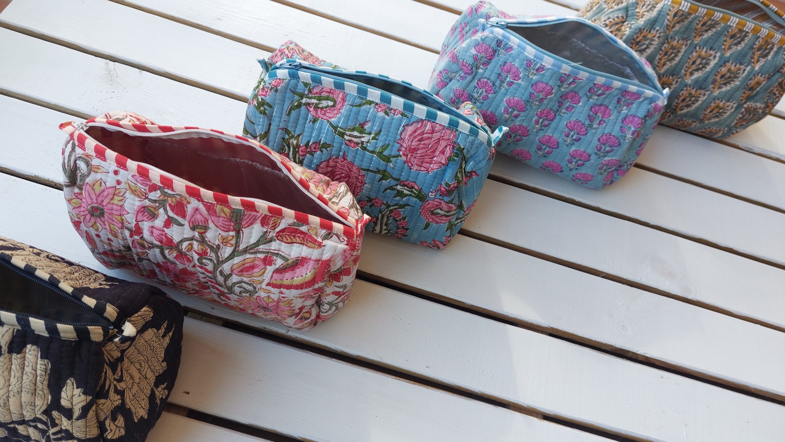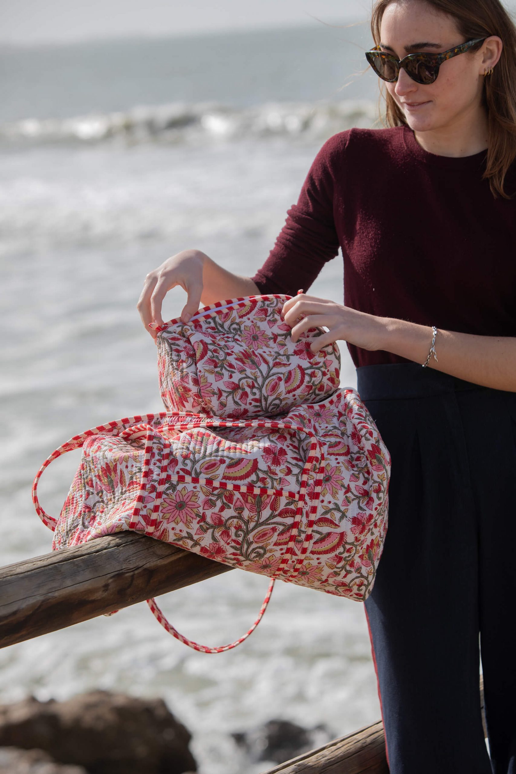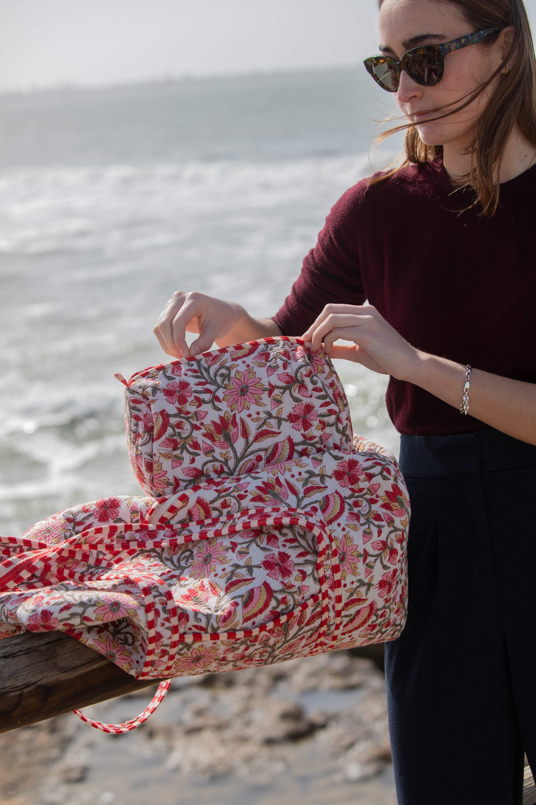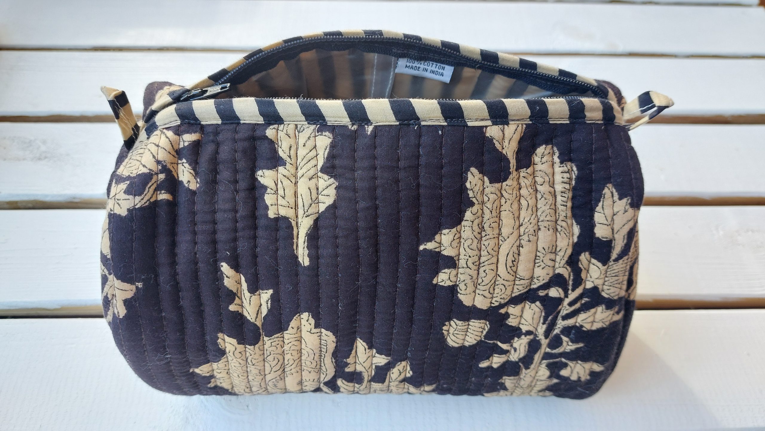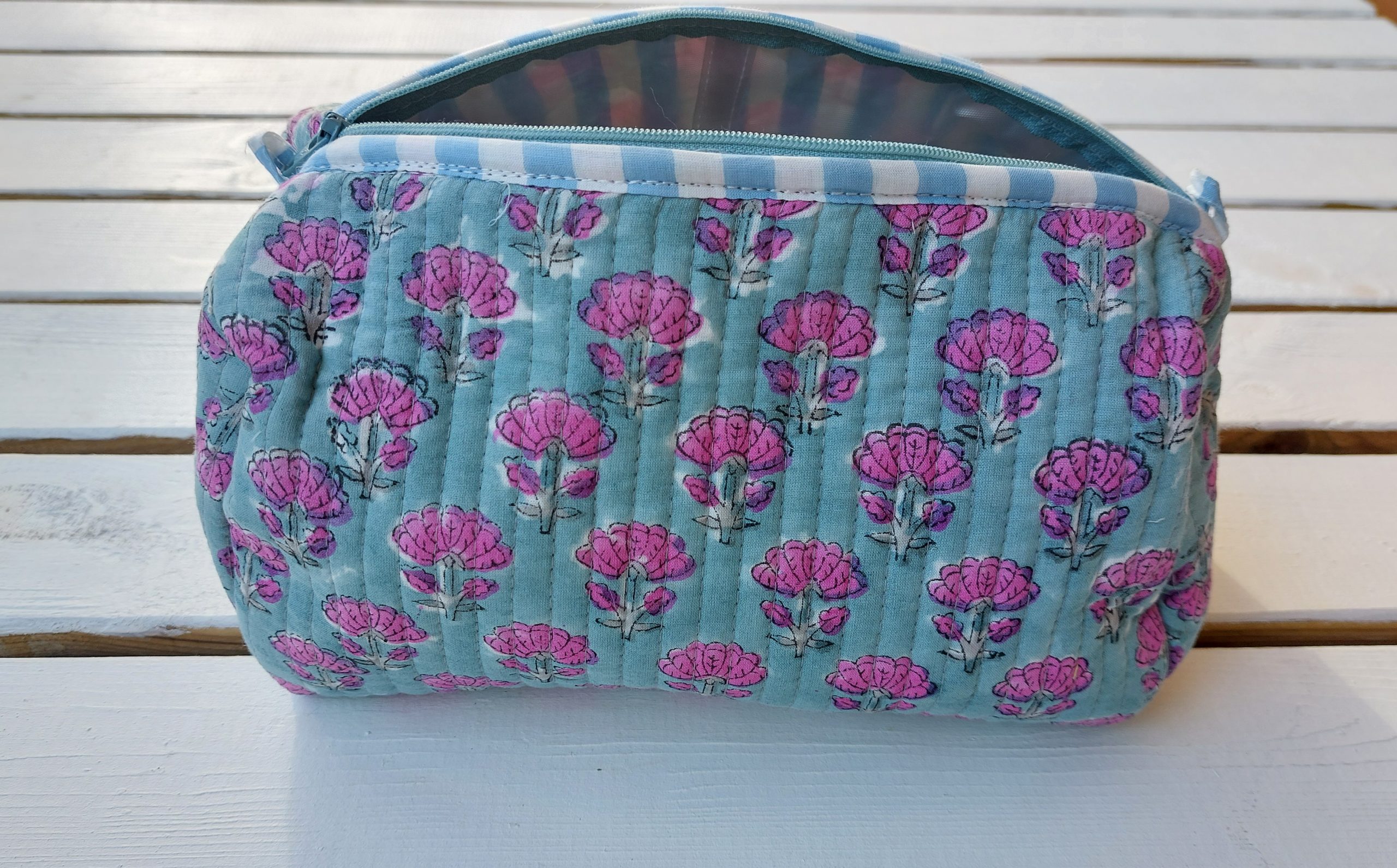 Neceser en tela de algodón acolchado y plastificado por dentro, con diferentes bolsillos para organizar de una manera más práctica.