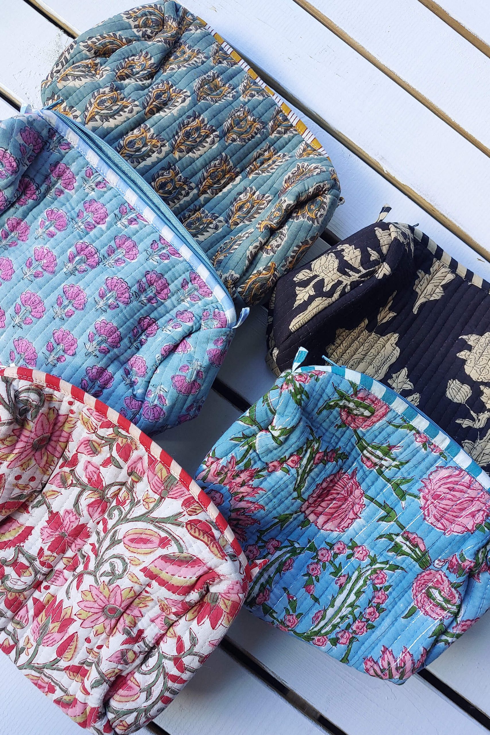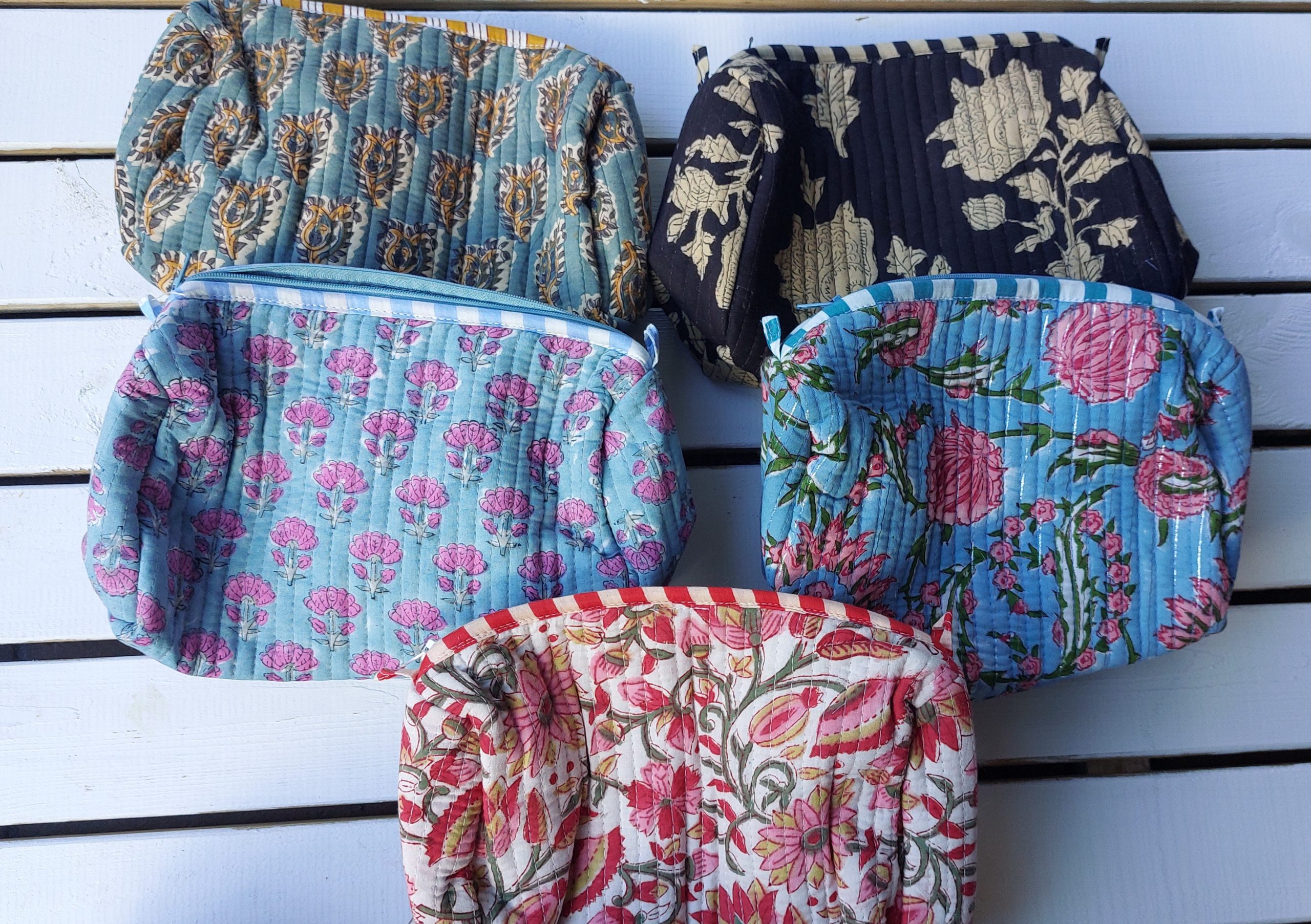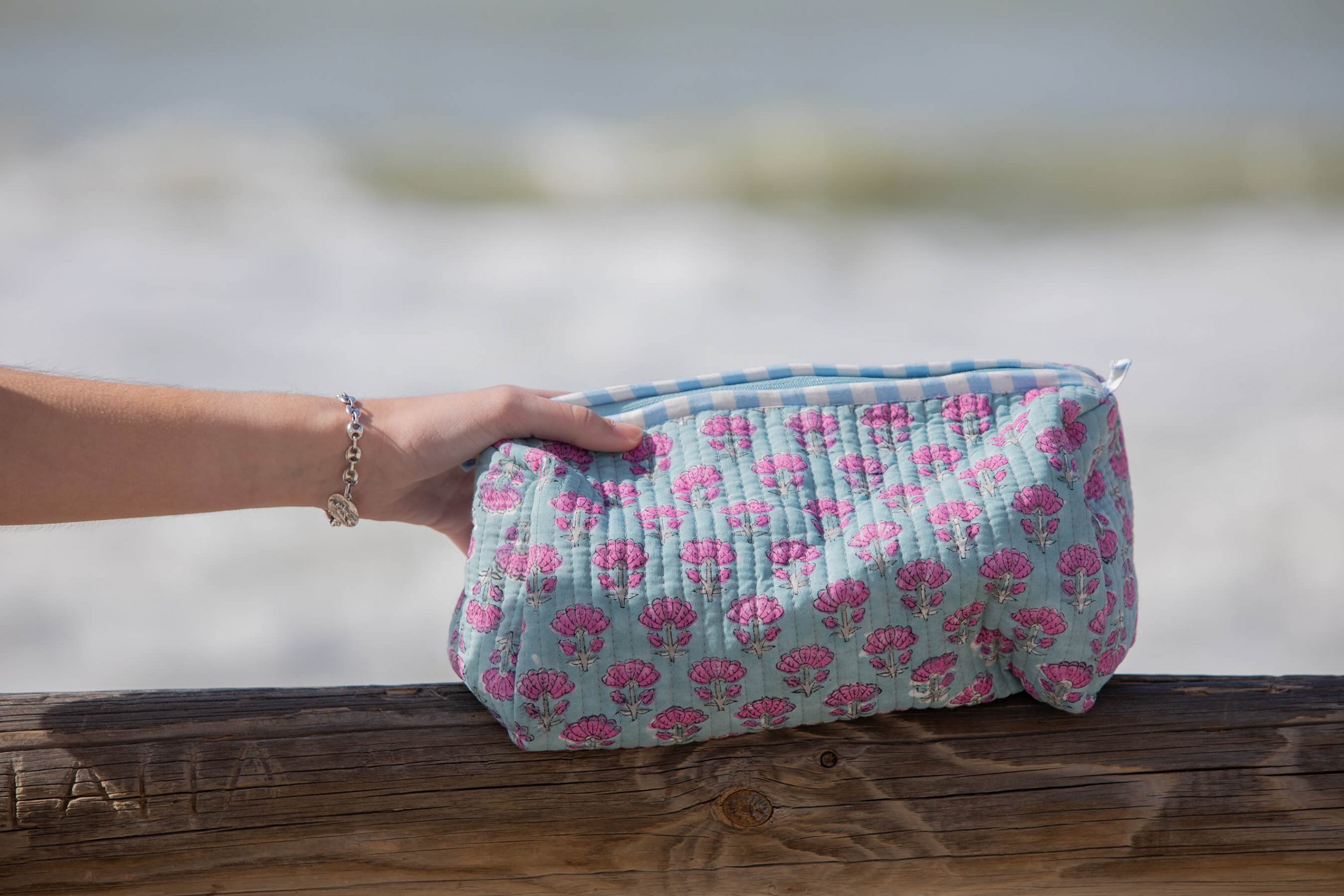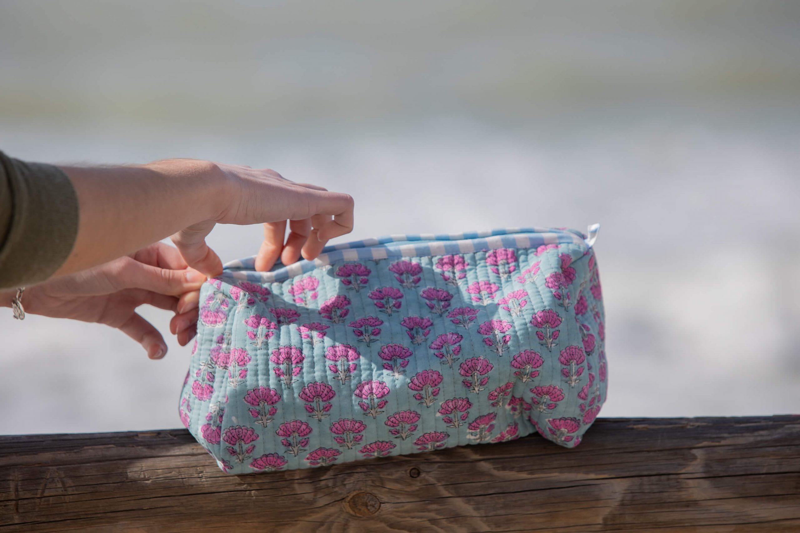 Neceser en tela de algodón acolchado y plastificado por dentro, con diferentes bolsillos para organizar de una manera más práctica.