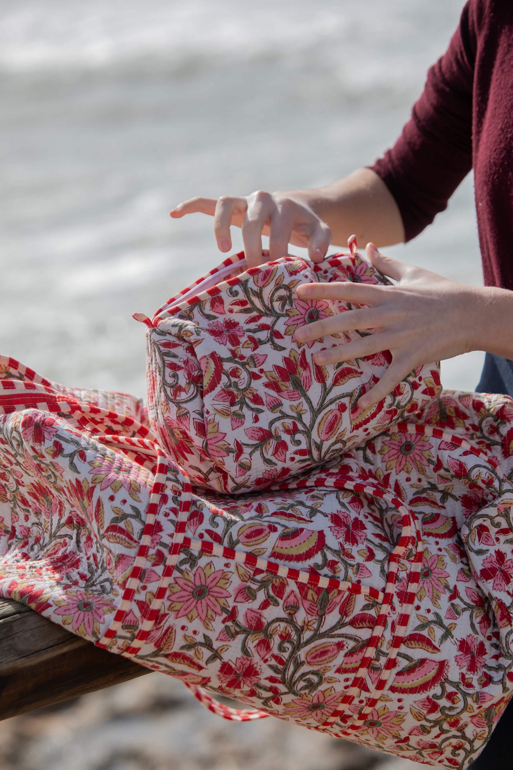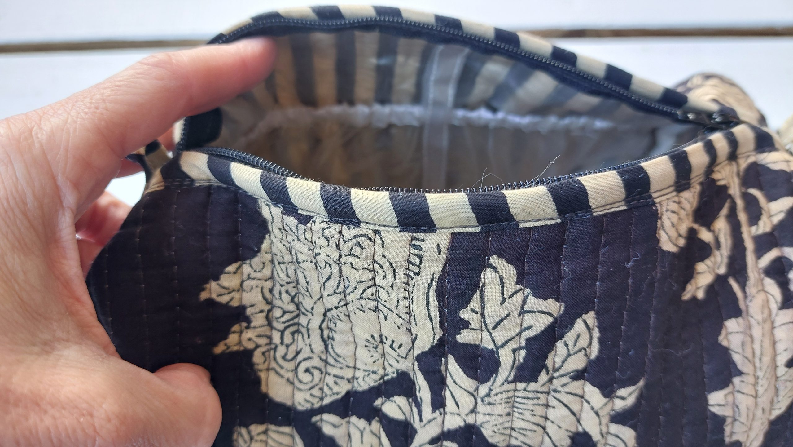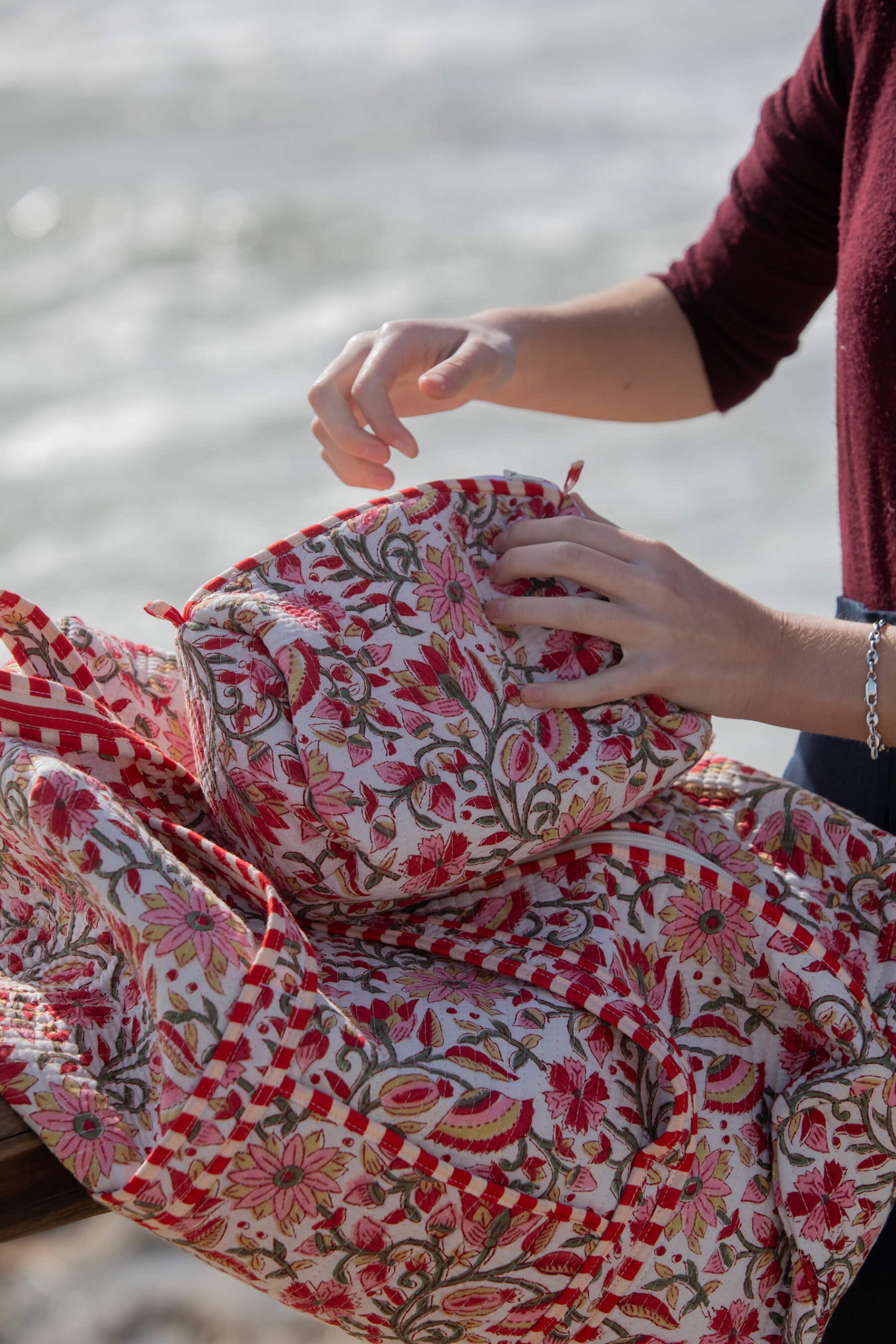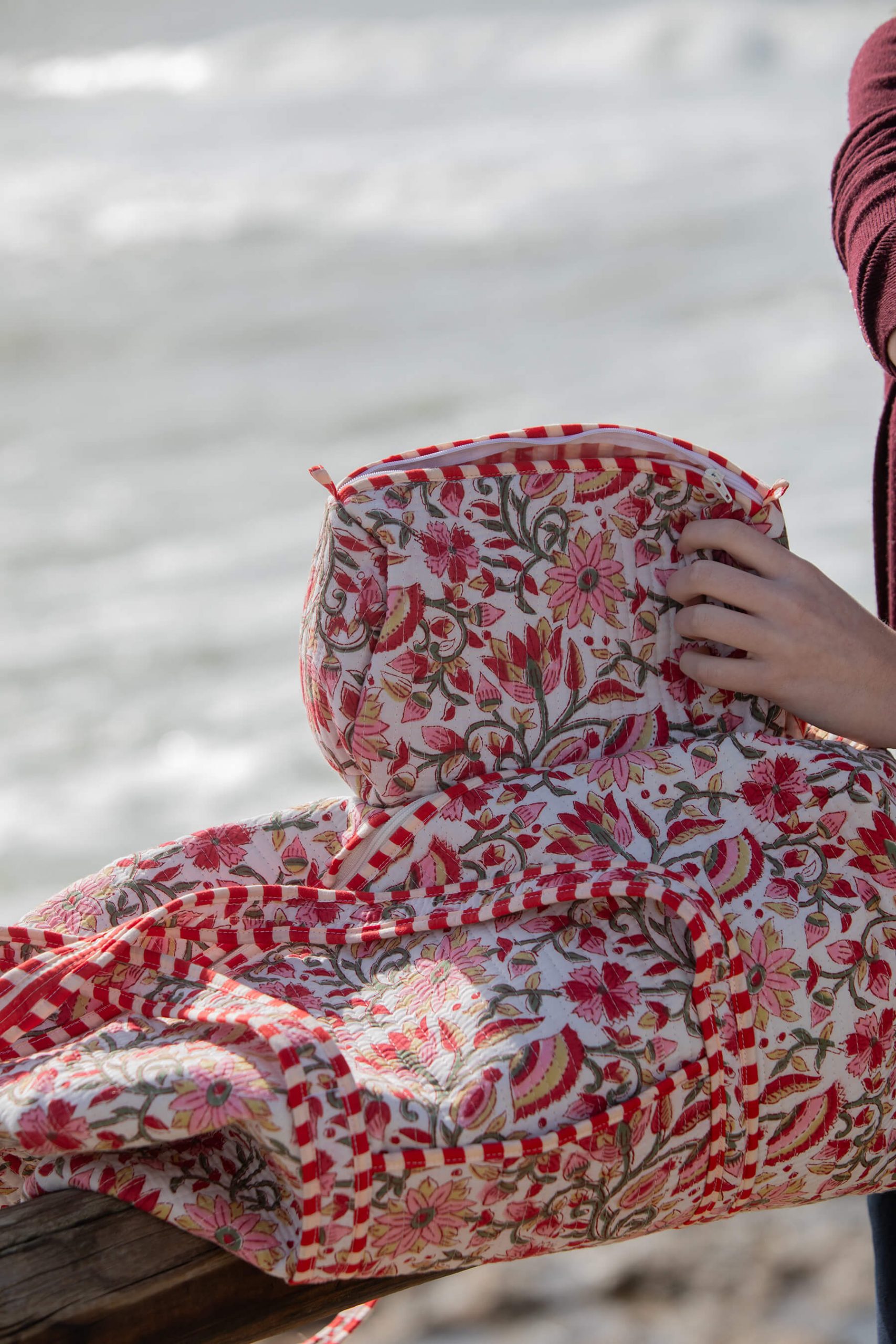 Neceser en tela de algodón acolchado y plastificado por dentro, con diferentes bolsillos para organizar de una manera más práctica.